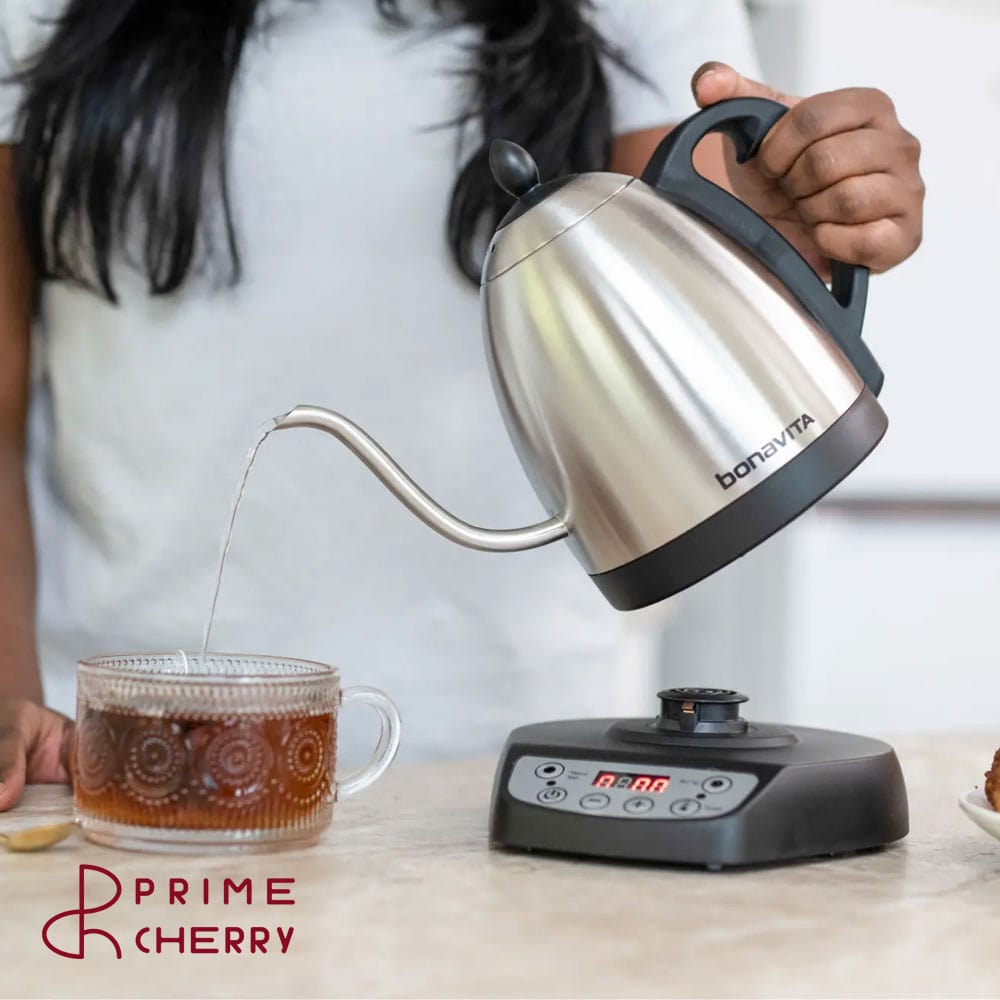 • طراحی خاص: کتل برقی بوناویتا با طراحی گردن باریک (Gooseneck) برای دم‌آوری دقیق قهوه و چای بسیار مناسب است. این طراحی به کنترل بهتر جریان آب کمک می‌کند و برای تهیه قهوه‌های دمی مانند کمکس و وی ۶۰ ایده‌آل است. این ویژگی کلیدی‌ترین بخش یک دم‌آوری دقیق و حرفه‌ای است.